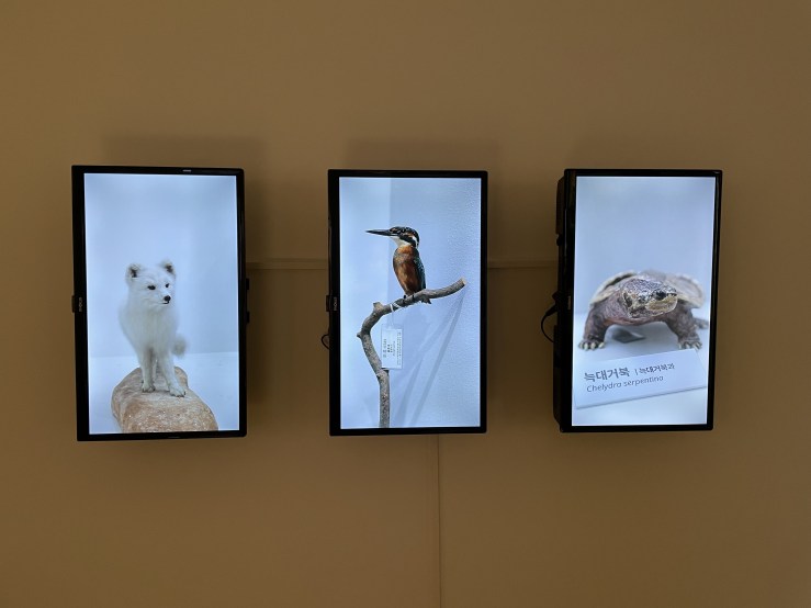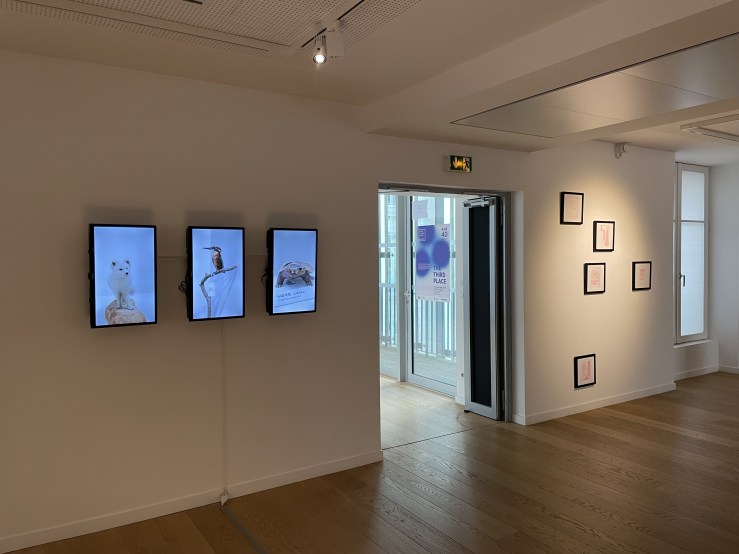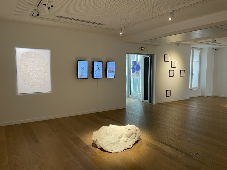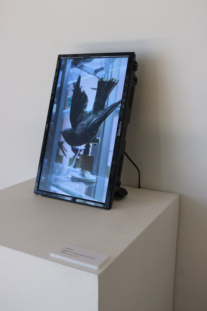 Légende de trois images en haut : Puisque c’est elle que j’ai mise sous globe, 2023, Installation d’écran / Vue d’exposition The Third Place, Centre Culturel Coréen, Paris, 2023-2024